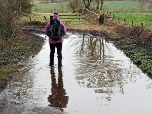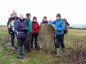Nine of us gathered in the large layby at the top end of Deep Dale, and gaiters were donned in anticipation of muddy conditions, with two having already decided on wearing wellies. We headed north on Wheal Lane, before taking the path gradually descending towards Taddington. The usual path from the stile across a field had been blocked by fencing [a misbehaving landowner?] but we easily re-joined the main path, before stopping for coffee on a convenient bench. Then a successful navigation of the very large puddle and muddy path of Hades Lane, before climbing out of Taddinton to Sough Top trig point [another Ethel to be ticked off by some] across fields to Sough Lane with surprisingly clear views south, before the lunch stop in Green Lane. An easy descent took us towards Flagg, with a short diversion on a grassy path off the Limestone Way, before leaving it again at Cross Lane to take us into Monyash. before then heading northwards across fields and yet more stiles back to our cars, just as the drizzle started.