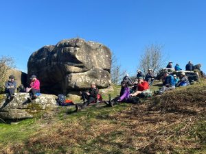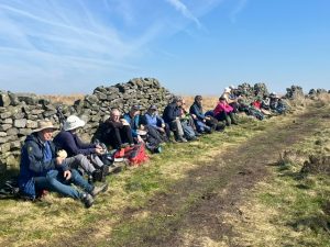 Well Linda M pulled out all the stops on the day regarding the weather. Wall to wall sunshine brought out the crowds. 21 started off along Curbar Edge with superb views in all directions. 2 of our number turned back just prior to the end of Froggatt Edge as they were on a shorter walk. Coffee break at the end of Froggatt – see pic.