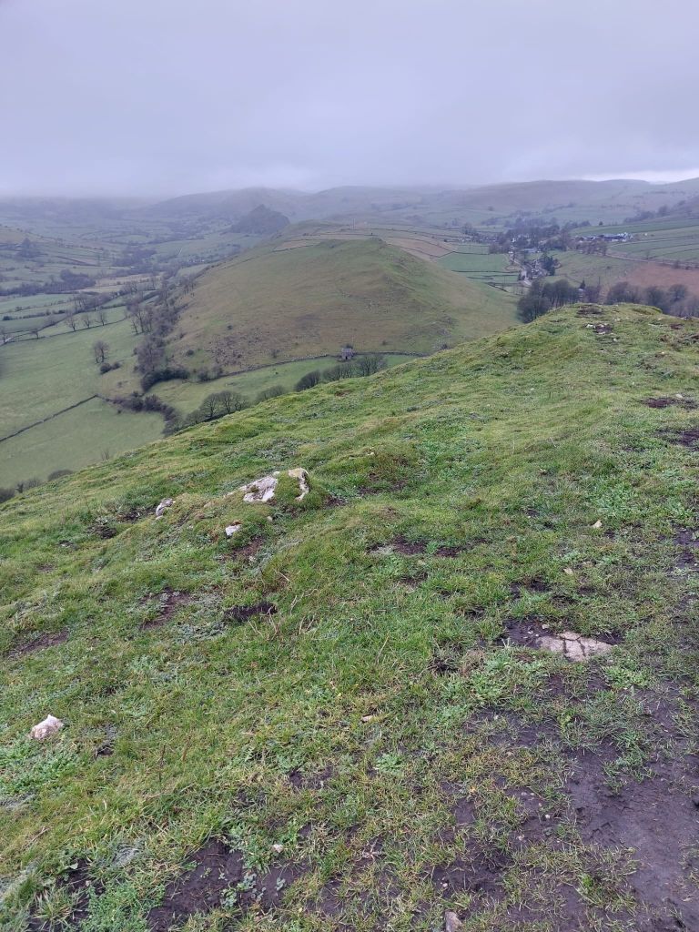 As planned, we traversed the base to reach the east ridge of Chrome Hill which we ascended by its slippery slope. The summit ridge with slippery limestone pinnacles was traversed with care and we then continued along the muddy trail past Stoop Farm and the grassy descent towards Booth Farm where we climbed to the airy summit of Hollins Hill.